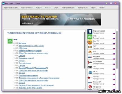Best UA-RU TV Player - новая, прекрасная программа для вольного просмотра телевизионных каналов из стран России и Украины, онлайн интернет-телевидения.Програмка полностью бесплатная и очень простая и удобная вупотреблении, интерфейс на русском языке. Все что нужно вам для просмотра - это подключенное к интернет соединению. Просмотр телеканалов возможен как в полноэкранном режиме, так и оконном
